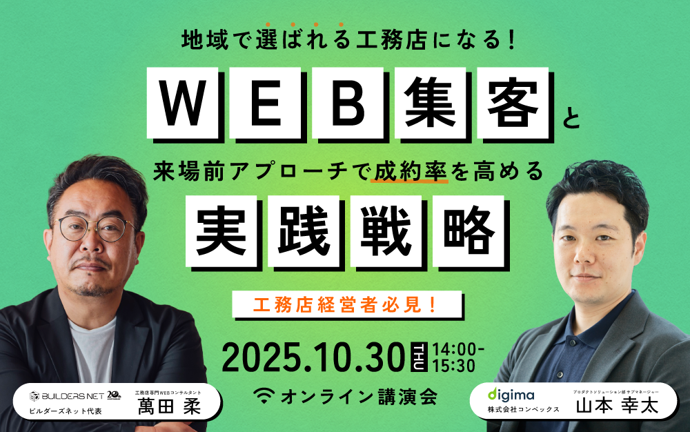 本セミナーでは、工務店に必要なWEBサイト運用の必勝法を具体的に解説。効率よく顧客を育成し、確度の高い見込み客を獲得するための考え方から、成功事例まで紹介します。