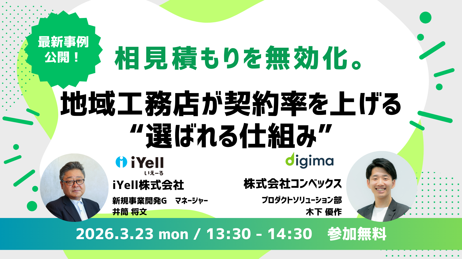 本セミナーでは、来場前に信頼を築く『ポールポジション戦略』と、大手を凌駕する『アフター保証の仕組み化』を公開 。入口(営業DX)から出口(アフター)までを網羅し、競合を寄せ付けない『1社勝ち』の極意を解説します。